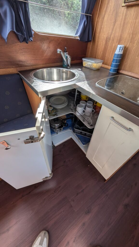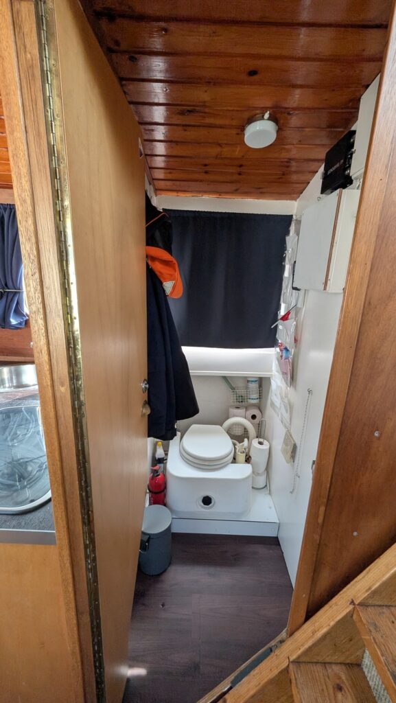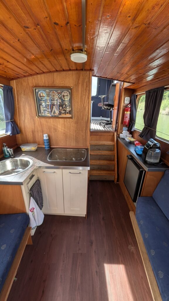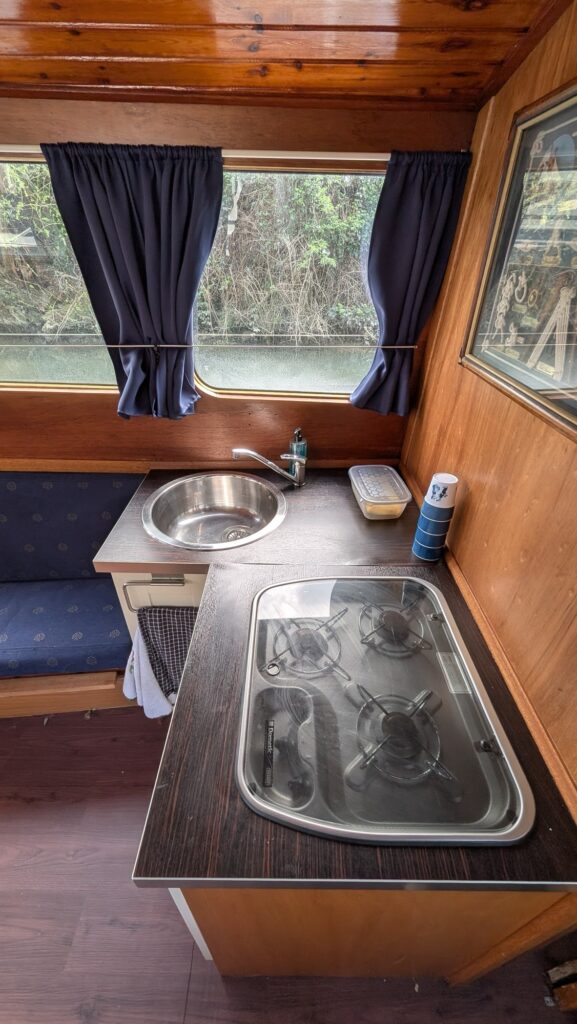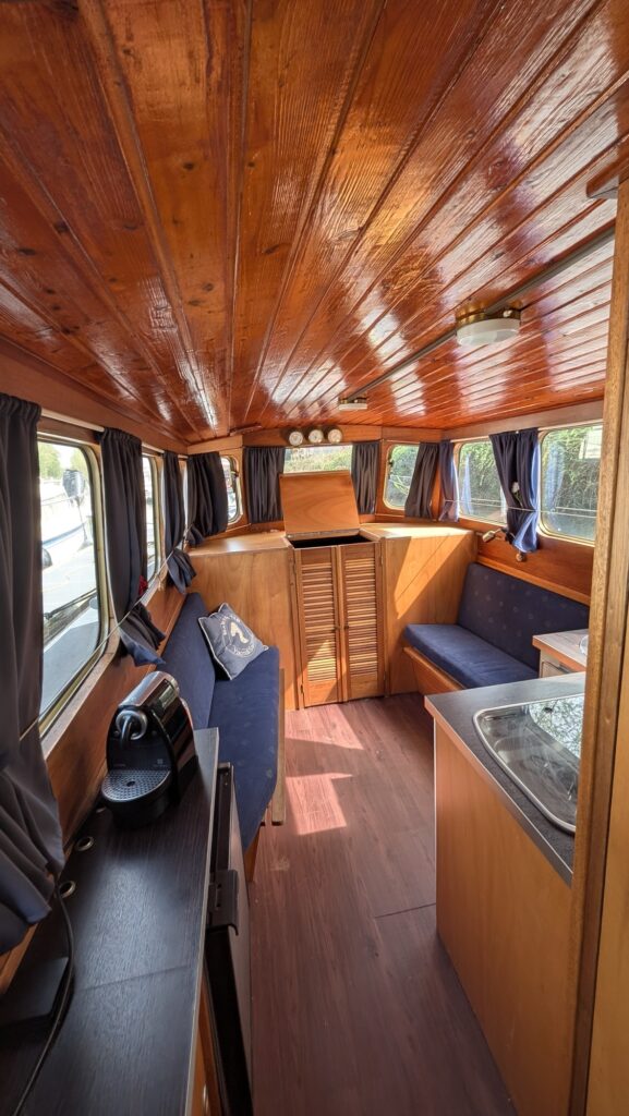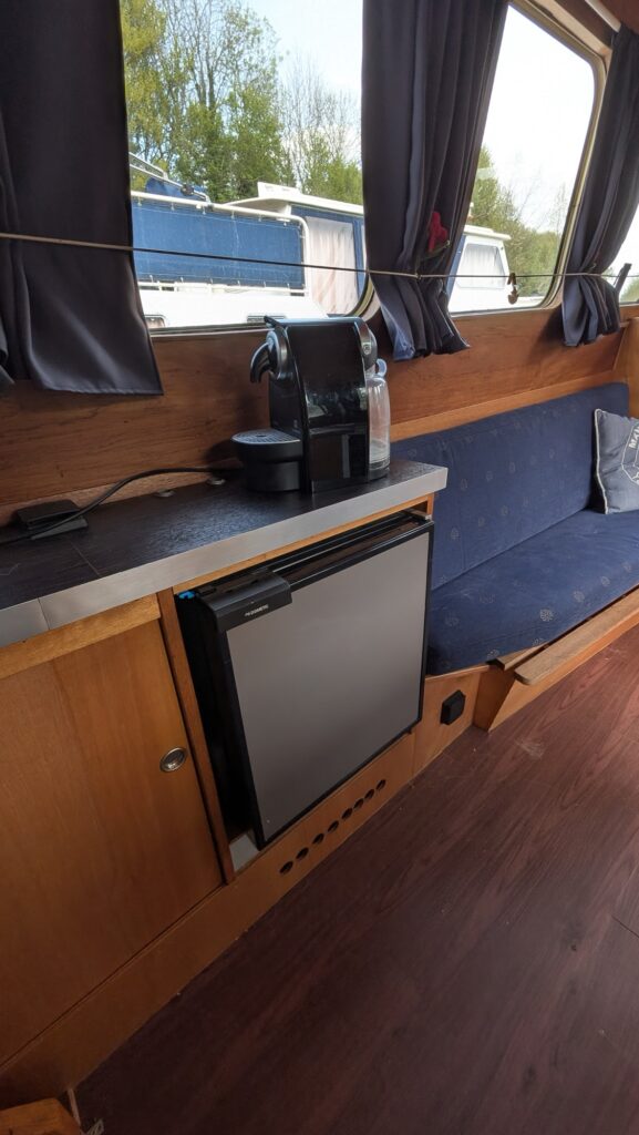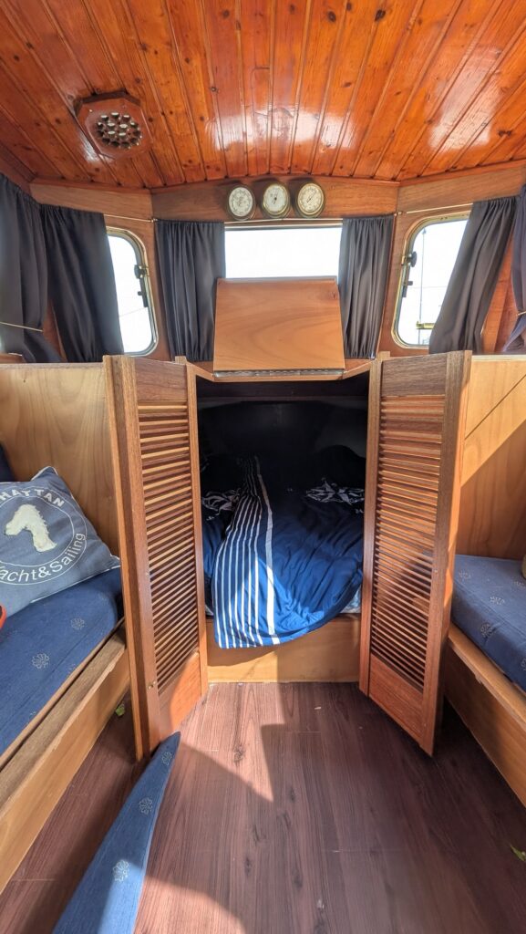 Kajuit stahoogte 195cm: ruim bed in de voorpunt/ toilet / keuken met koelkast (24 volt) en 2 pits gas toestel